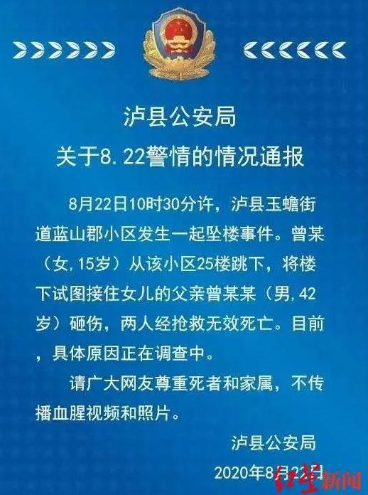 8月22日10时30分许,泸县玉蟾街道蓝山郡小区发生一起坠楼事件。曾某(女,15岁)从该小区25楼跳下,将楼下试图接住女儿的父亲曾某某(男,42岁)砸伤,两人经抢救无效死亡。目前具体原因正在调查中。