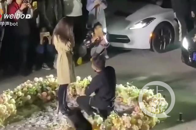 上游新闻记者注意到,网传求婚视频中显示,多辆跑车停在校内并悬挂粉色气球,地面铺满鲜花,一名黑衣男子手捧鲜花,单膝跪地,向一名女生献花。与此同时,烟花升空,多名摄影师执摄影机在跟拍。浪漫场面引发大量学生聚集围观,不断发出尖叫欢呼声。
