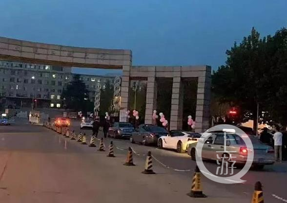 ▲多辆豪车悬挂彩色气球,声势浩大地从学校大门进入校园。图片来源/网络