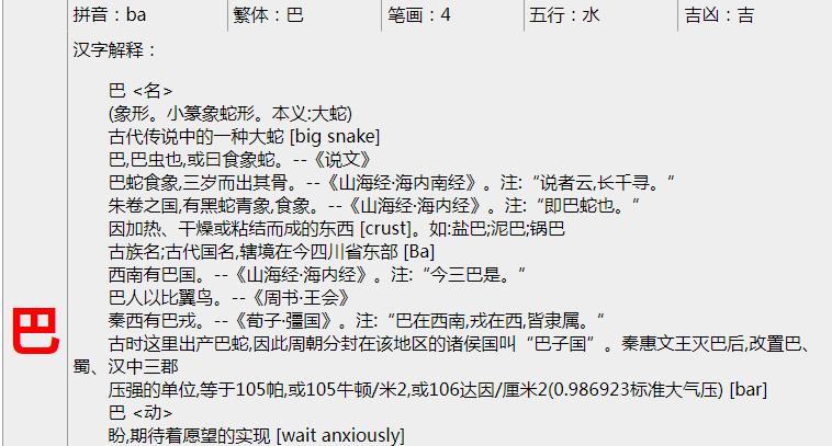巴 拼音:ba 繁体:巴 笔画:4 五行:水 吉凶:吉