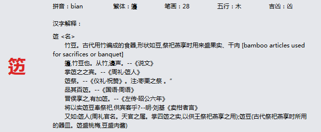 笾 拼音:bian 繁体:籩 笔画:28 五行:木 吉凶:凶