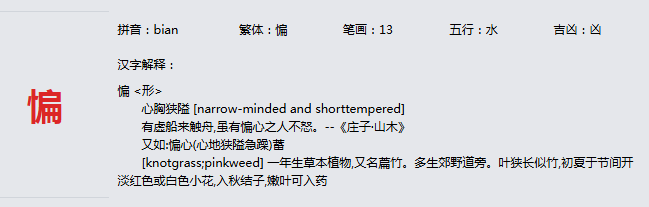 惼 拼音:bian 繁体:惼 笔画:13 五行:水 吉凶:凶