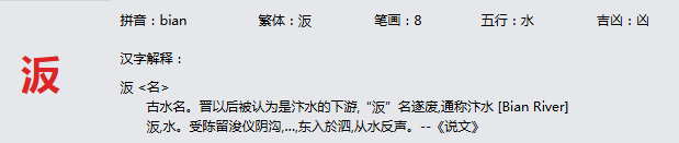 汳 拼音:bian 繁体:汳 笔画:8 五行:水 吉凶:凶