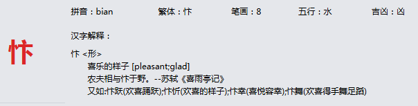 忭 拼音:bian 繁体:忭 笔画:8 五行:水 吉凶:凶