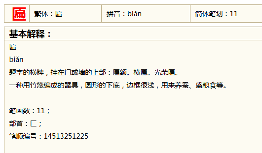 匾 繁体:匾 拼音:biǎn 简体笔划:11 繁体笔划:11 部首:匚 五笔输入法:ayna