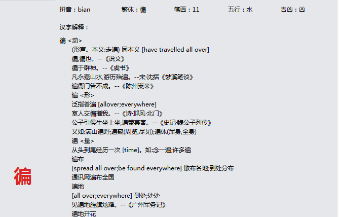 徧 拼音:bian 繁体:徧 笔画:11 五行:水 吉凶:凶