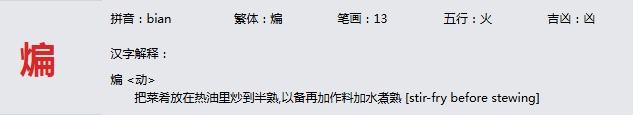 煸 拼音:bian 繁体:煸 笔画:13 五行:火 吉凶:凶