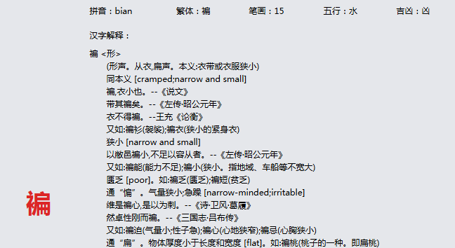 褊 拼音:bian 繁体:褊 笔画:15 五行:水 吉凶:凶