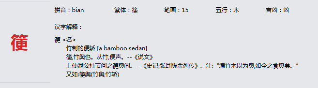箯 拼音:bian 繁体:箯 笔画:15 五行:木 吉凶:凶