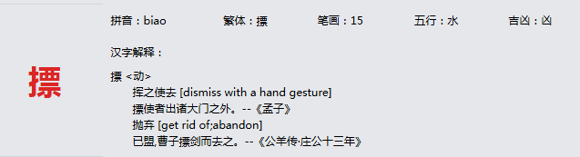 摽 拼音:biao 繁体:摽 笔画:15 五行:水 吉凶:凶