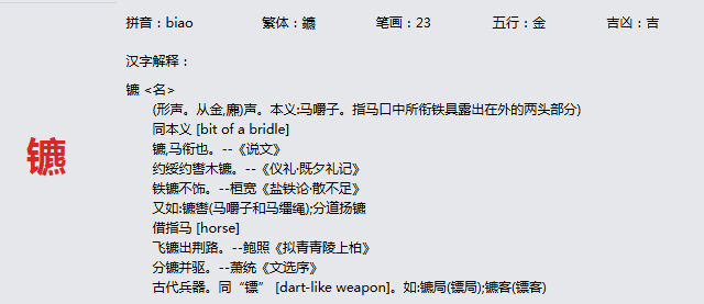镳 拼音:biao 繁体:鑣 笔画:23 五行:金 吉凶:吉