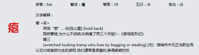 瘪 拼音:bie 繁体:癟 笔画:19 五行:水 吉凶:凶