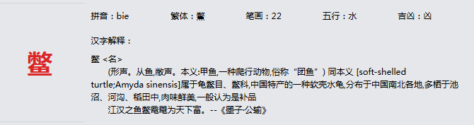 鳖 拼音:bie 繁体:鱉 笔画:22 五行:水 吉凶:凶
