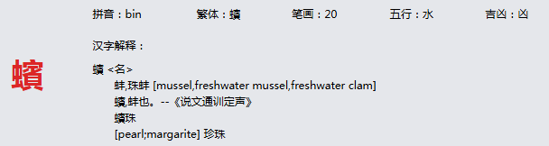 蠙 拼音:bin 繁体:蠙 笔画:20 五行:水 吉凶:凶