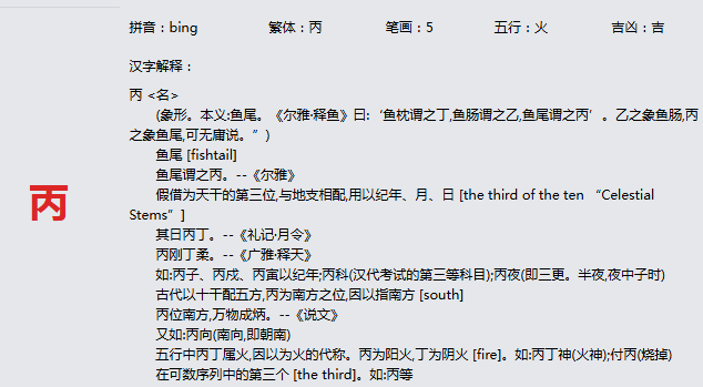 丙 拼音:bing 繁体:丙 笔画:5 五行:火 吉凶:吉