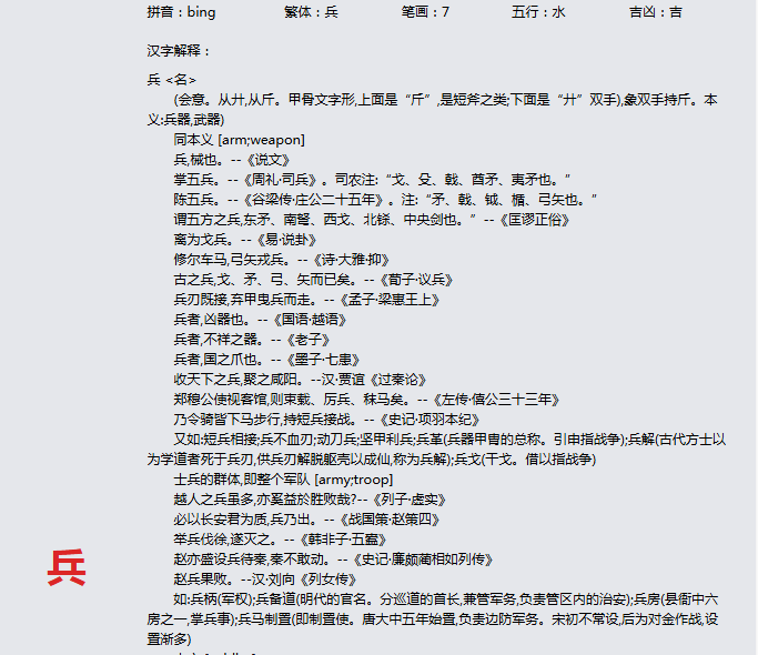 兵 拼音:bing 繁体:兵 笔画:7 五行:水 吉凶:吉