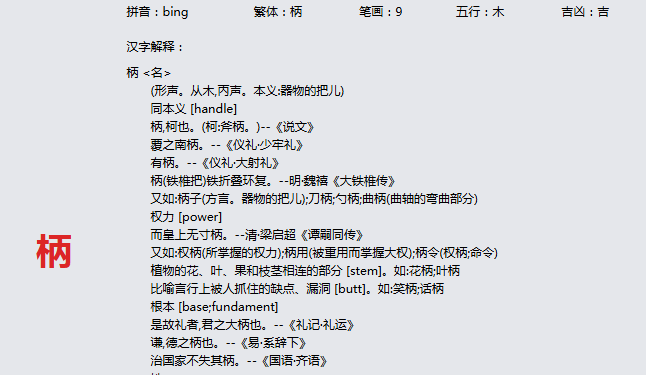 柄 拼音:bing 繁体:柄 笔画:9 五行:木 吉凶:吉