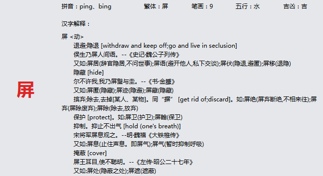 屏 拼音:ping、bing 繁体:屏 笔画:9 五行:水 吉凶:吉