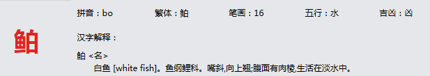 鲌 拼音:bo 繁体:鮊 笔画:16 五行:水 吉凶:凶