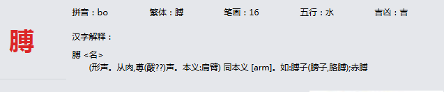 膊 拼音:bo 繁体:膊 笔画:16 五行:水 吉凶:吉