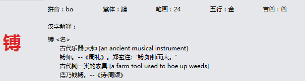 镈 拼音:bo 繁体:鑮 笔画:24 五行:金 吉凶:凶