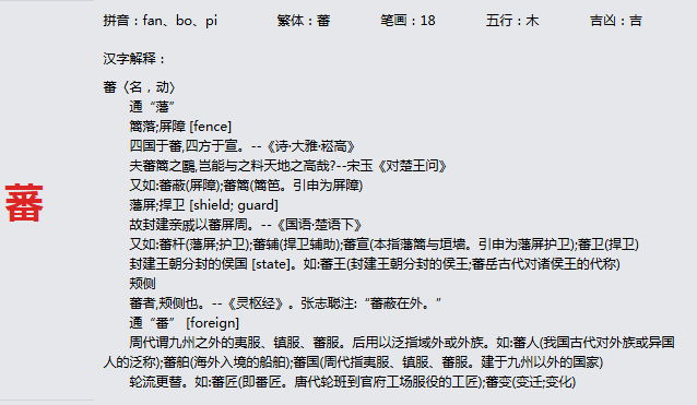 蕃 拼音:fan、bo、pi 繁体:蕃 笔画:18 五行:木 吉凶:吉