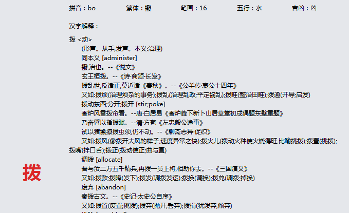 拨 拼音:bo 繁体:撥 笔画:16 五行:水 吉凶:凶