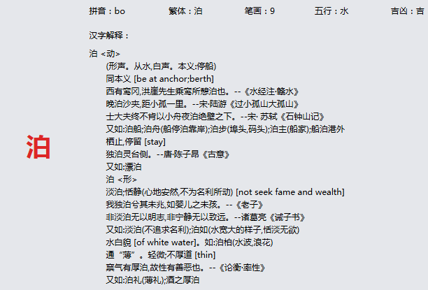 泊 拼音:bo 繁体:泊 笔画:9 五行:水 吉凶:吉