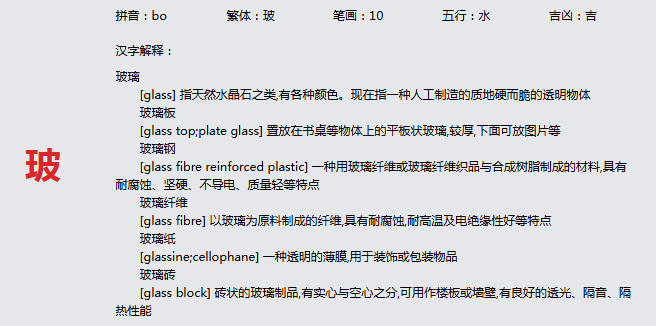 玻 拼音:bo 繁体:玻 笔画:10 五行:水 吉凶:吉