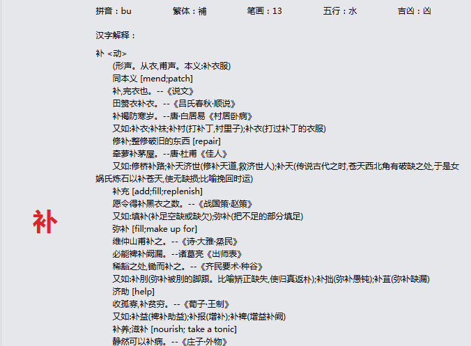 补 拼音:bu 繁体:補 笔画:13 五行:水 吉凶:凶