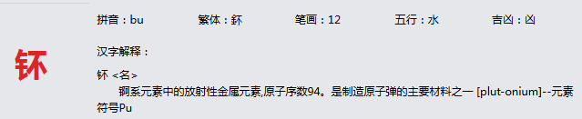 钚 拼音:bu 繁体:鈈 笔画:12 五行:水 吉凶:凶