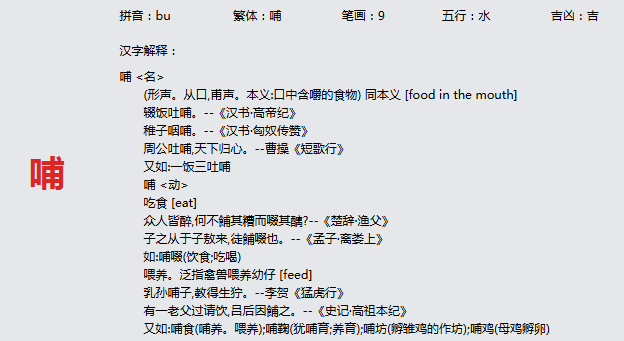 哺 拼音:bu 繁体:哺 笔画:9 五行:水 吉凶:吉