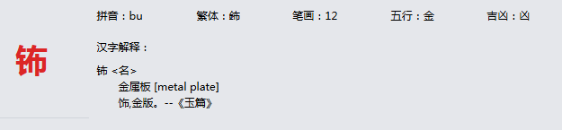 钸 拼音:bu 繁体:鈽 笔画:12 五行:金 吉凶:凶