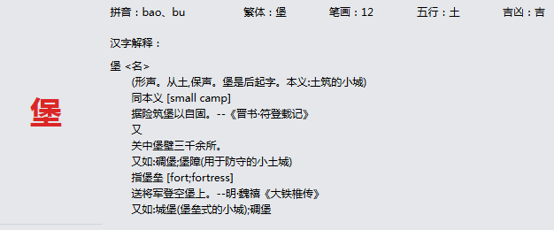 堡 拼音:bao、bu 繁体:堡 笔画:12 五行:土 吉凶:吉