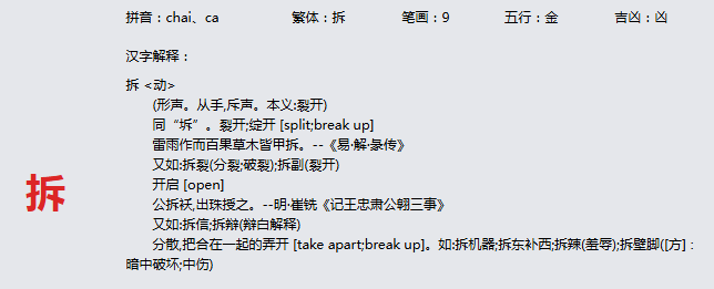 拆 拼音:chai、ca 繁体:拆 笔画:9 五行:金 吉凶:凶