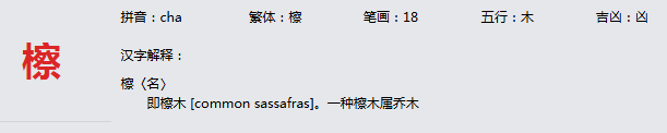 檫 拼音:cha 繁体:檫 笔画:18 五行:木 吉凶:凶