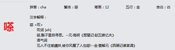 嗏 拼音:cha 繁体:嗏 笔画:12 五行:金 吉凶:凶