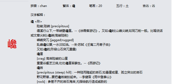 巉 拼音:chan 繁体:巉 笔画:20 五行:土 吉凶:凶