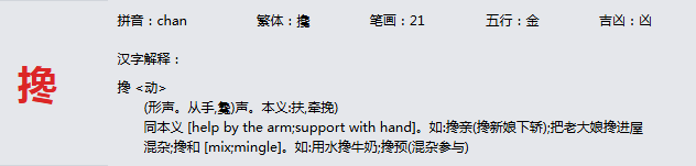 搀 拼音:chan 繁体:攙 笔画:21 五行:金 吉凶:凶