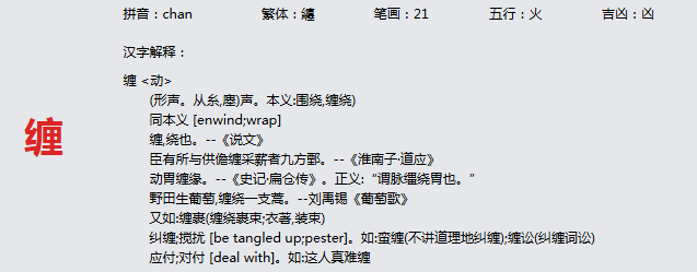 缠 拼音:chan 繁体:纏 笔画:21 五行:火 吉凶:凶