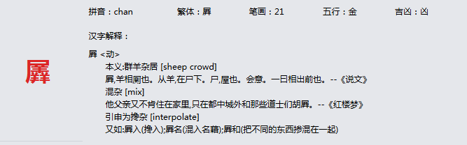 羼 拼音:chan 繁体:羼 笔画:21 五行:金 吉凶:凶