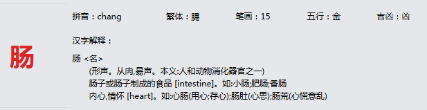 肠 拼音:chang 繁体:腸 笔画:15 五行:金 吉凶:凶
