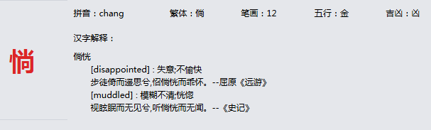 惝 拼音:chang 繁体:惝 笔画:12 五行:金 吉凶:凶