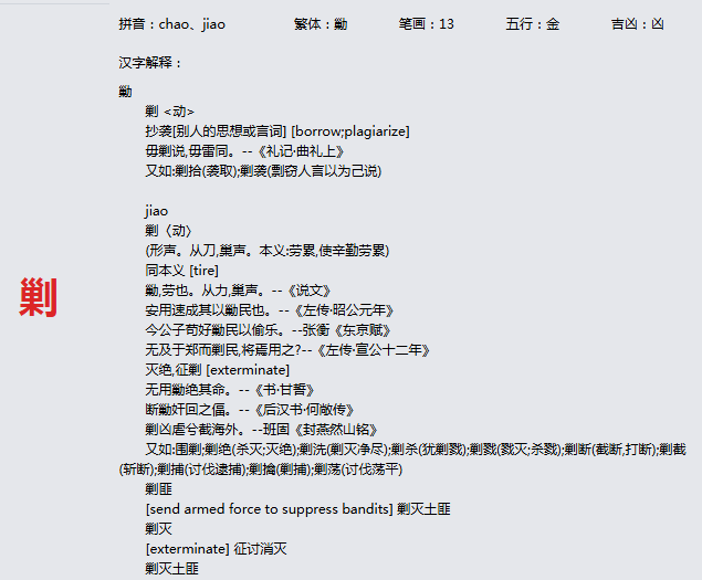剿 拼音:chao、jiao 繁体:勦 笔画:13 五行:金 吉凶:凶