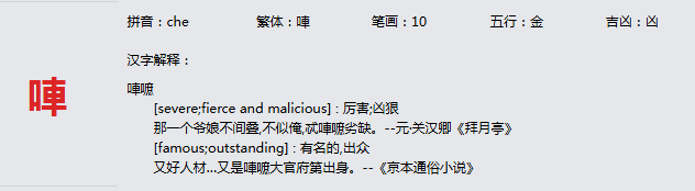 唓 拼音:che 繁体:唓 笔画:10 五行:金 吉凶:凶
