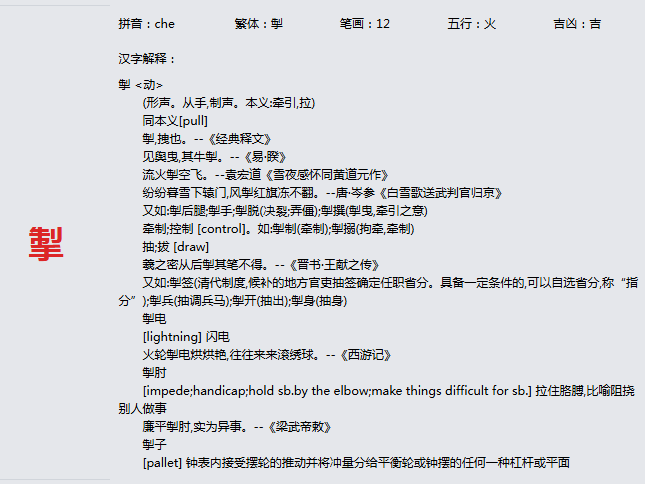 掣 拼音:che 繁体:掣 笔画:12 五行:火 吉凶:吉