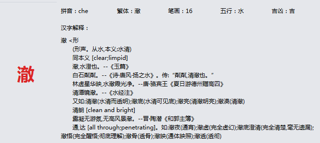 澈 拼音:che 繁体:澈 笔画:16 五行:水 吉凶:吉