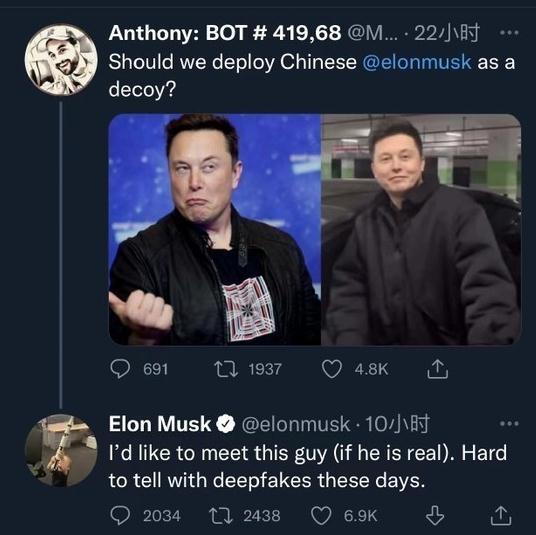 5月10日,Twitter上有网友发布了特斯拉CEO埃隆·马斯克和“中国版”马斯克的照片,并@了马斯克。对此,马斯克在回复该网友时表示:“我想见见这个人(如果他是真的)。目前这很难用深度造假技术来分辨。